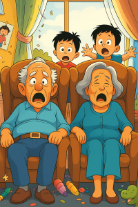 By 10:12 a.m., the living room looked like a toy factory exploded during a disco. There were LEGOs in the fish tank, applesauce on the ceiling, and someone had used a marker to draw a six-pack on Frank’s bald belly while he dozed off.