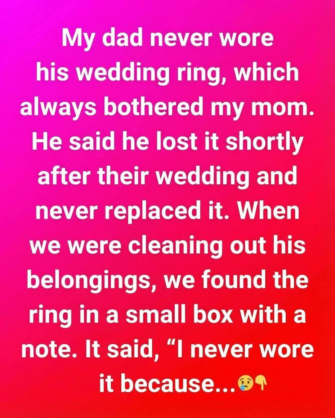 My dad never wore his wedding ring, and it always bothered my mom. She noticed it early in their marriage and never stopped noticing. Whenever she saw other husbands proudly wearing theirs, a quiet sadness crossed her face. When she asked my dad, he always gave the same calm answer: he’d lost it shortly after the wedding and saw no reason to replace it. Eventually she stopped asking, but I knew it hurt. To her, the ring wasn’t jewelry—it was belonging.